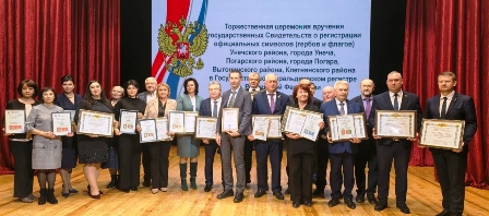 Торжественная церемония вручения государственных Свидетельств о регистрации официальных символов В МУК МКДУ (клуб им. 1 Мая) состоялась торжественная церемония вручения государственных Свидетельств о регистрации официальных символов (гербов и флагов) Унечского района, города Унеча, Погарского района, города Погара, Выгоничского района и Клетнянского района в Государственном геральдическом регистре Российской Федерации. В торжественной церемонии принимали участие: президент Евразийского гербового центра, член комиссии Геральдического Совета при Президенте Российской Федерации по вопросам муниципальной символики Ю.Ю. Росич; глава Унечского района, председатель Унечского районного Совета народных депутатов А.М. Кусков; глава администрации Унечского района - В.А. Дуда; глава города Унеча А.А. Рубан; глава Погарского района, председатель Погарского районного Совета народных депутатов Г.А. Гунарь; глава администрации Погарского района С.И. Цыганок; глава Погарского городского поселения С.В. Сучкова; глава Выгоничского района, председатель Выгоничского районного Совета народных депутатов С.В. Коршунов; глава администрации Выгоничского района А.Г. Юркин; глава Клетнянского района, председатель Клетнянского районного Совета народных депутатов А.П. Сеничкина; глава администрации Клетнянского района Н.В.Ковалева; почетные жители, заместители глав администраций и руководители учреждений и организаций Унечского, Погарского, Выгоничского и Клетнянского районов. В торжественной обстановке главам муниципальных образований были вручены государственные Свидетельства о регистрации официальных символов (гербов и флагов) и благодарности. Так же были вручены благодарности за активное участие в создании, утверждении и регистрации официальных символов. В завершении торжественной части для присутствующих выступили творческие коллективы и солисты МУК МКДУ (клуб им. 1 Мая).